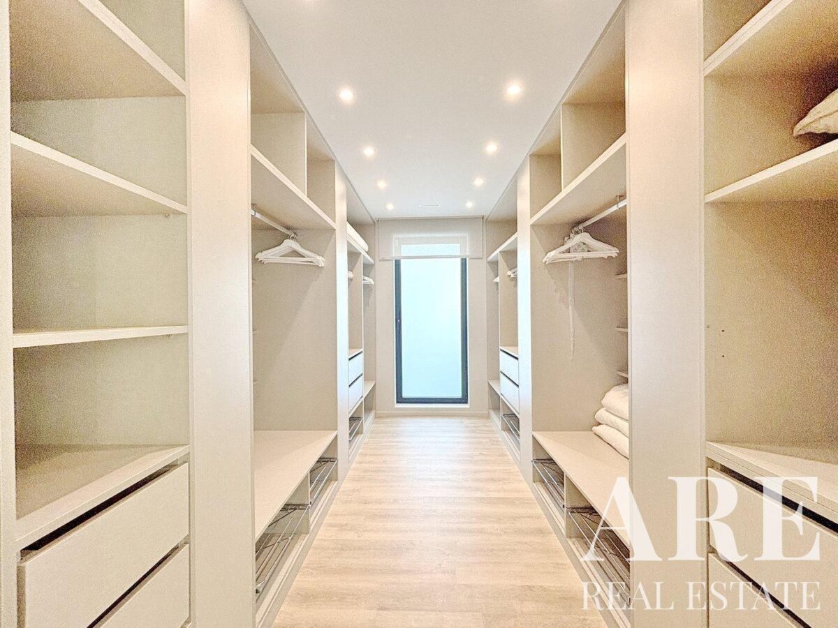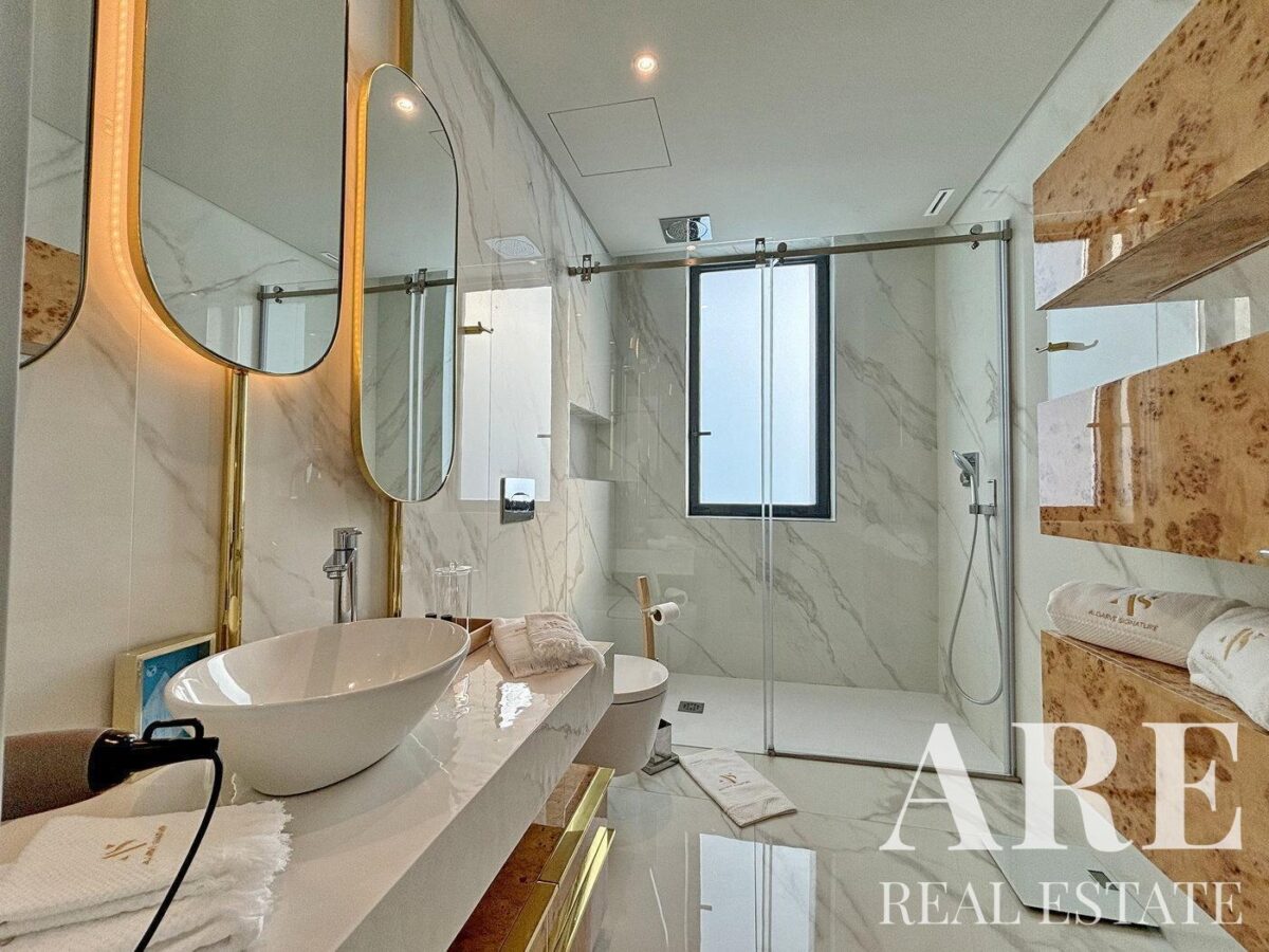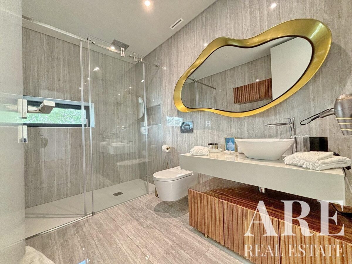 El interior de la villa incluye 10 baños, un gimnasio equipado con máquinas de pesas y mancuernas, y una sala de cine con sistema audiovisual y consola de juegos. Además, dispone de un spa con sauna y baño turco. La villa está equipada con un sistema de seguridad avanzado que incluye alarma y videovigilancia. Las persianas eléctricas están instaladas en todas las habitaciones, y los paneles solares proporcionan calentamiento de agua.