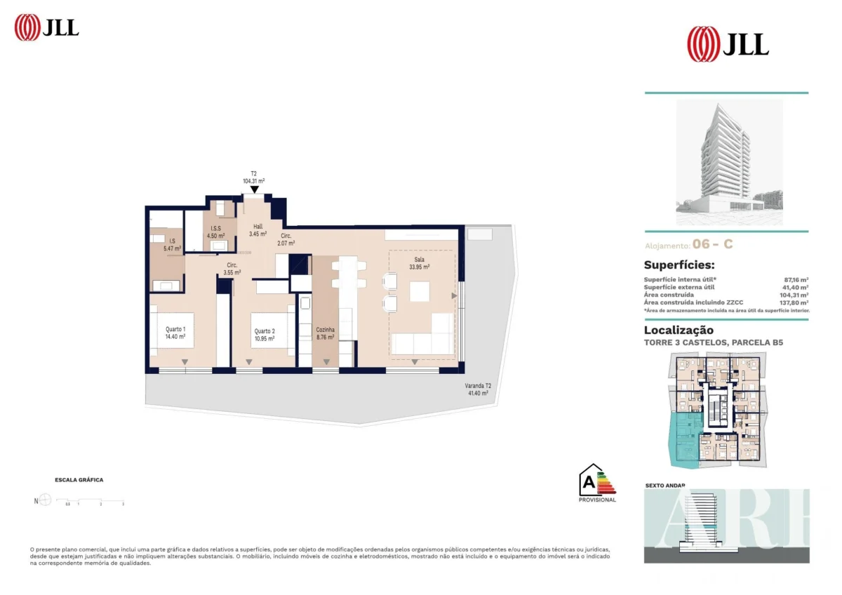 Appartement à vendre à Portimão, Algarve, Portugal, avec 2 chambres et vue mer. Immeuble résidentiel Premium. Cet appartement de plain-pied est situé au sixième étage et offre une surface intérieure de 104 m². Il comprend 2 salles de bains et est orienté à l’ouest, ce qui permet de profiter de magnifiques couchers de soleil. Les espaces extérieurs incluent des balcons totalisant 41,4 m², parfaits pour se détendre en plein air.