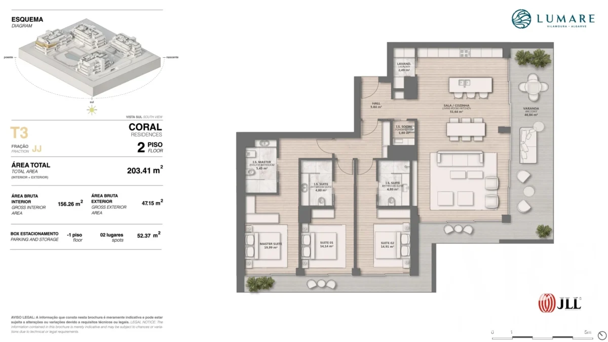 Appartement à vendre dans Sector 5, Vilamoura, Algarve, Portugal, avec 3 chambres et vue mer. Immeuble résidentiel Premium. Cet appartement de plain-pied est situé au deuxième étage et offre une surface intérieure de 156 m². Construit en 2027, il bénéficie d’une orientation sud, maximisant ainsi l’ensoleillement. L’appartement comprend 4 salles de bains, une piscine extérieure, et des balcons totalisant 46,84 m², parfaits pour profiter de la vue.