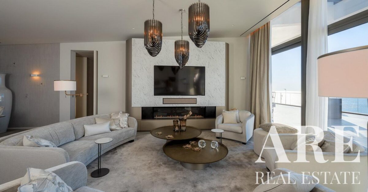 The penthouse spans an approximate total area of 700m², which includes 210m² of interior living space and a 480m² terrace. Inside, the penthouse features an open-plan layout with a large living room equipped with a cosy fireplace. The space also includes a separate, well-appointed dining area and a modern kitchen fitted with the latest appliances. There are three furnished bedrooms, designed to offer both comfort and style. The bathrooms are equipped with luxury fixtures, including a circular bathtub with gold faucets and white marble tiling, enhancing the overall sophistication of the space.