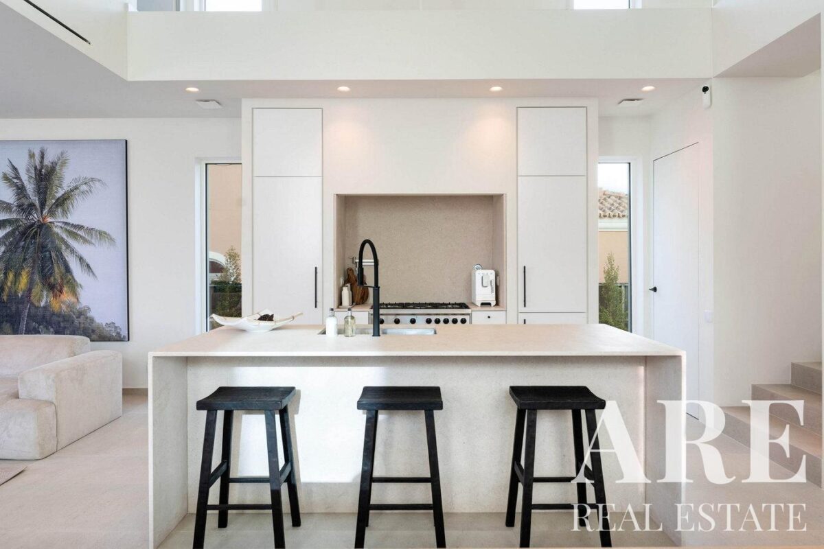 Entering the villa, we find a generous living and dining space that opens directly onto an attractive swimming pool. This area is marked by a soaring ceiling, lending an air and sense of expansiveness to the space. Extensive windows infuse the interior with natural light, creating a seamless blend of indoor and outdoor living. There’s also an open-plan kitchen outfitted with premium SMEG appliances.