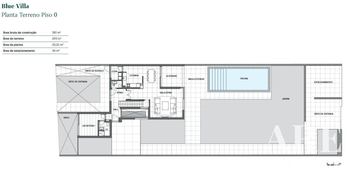 The Blue Villa, with a total plot area of 693 square meters, and a construction area of 281 square meters, are divided into three floors.