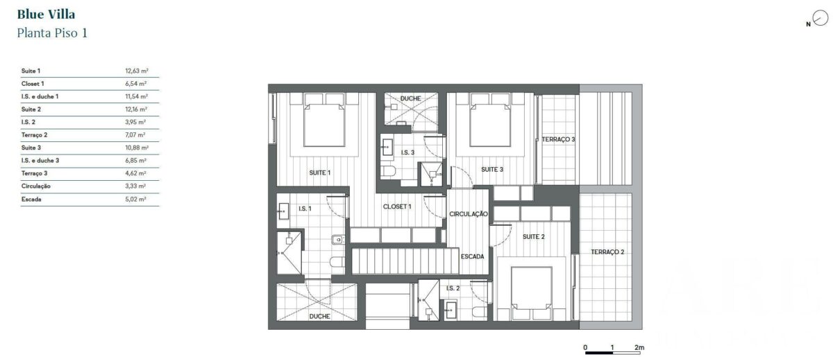 The upper floor houses three en-suite bedrooms, each with a private bathroom, outdoor shower and private balconies.