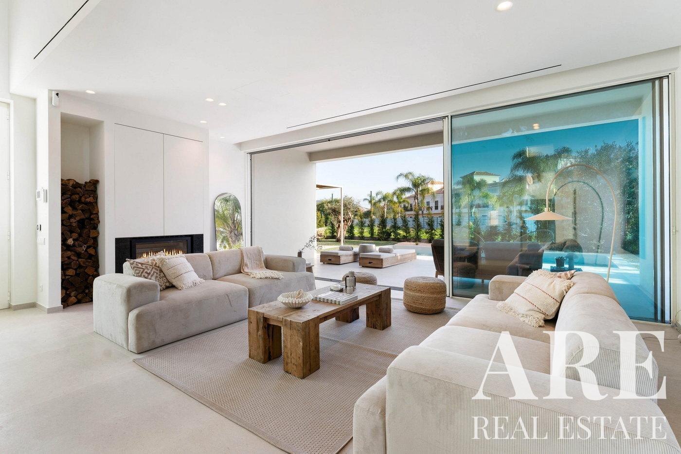 Ao entrar na moradia encontramos um generoso espaço de estar e jantar com acesso direto para a piscina e um terraço coberto. Esta área é marcada por um teto alto, conferindo ar e sensação de amplitude ao espaço. Extensas janelas permitem a entrada de luz natural no interior, criando uma mistura perfeita de vida interna e externa. Há também uma cozinha em plano aberto equipada com eletrodomésticos SMEG.